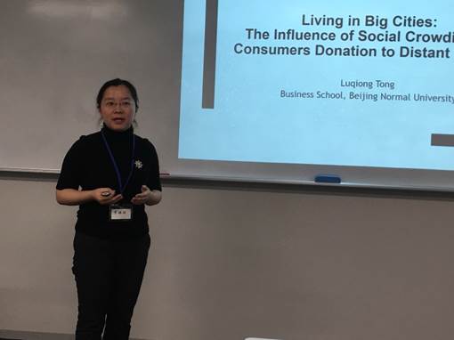 童璐瓊副教授匯報了“住在大城市:社會擁擠對消費者遠距離捐贈的影響”。她指出捐贈者與捐贈活動的距離對慈善行為有較大的影響,消費者傾向于對空間距離較近的受助者提供幫助。她通過實驗的方法,研究社會擁擠對捐贈活動的影響。實驗結果表明,擁擠程度顯著降低了近距離捐贈行為的概率,提高了遠距離捐贈行為的概率。在大城市日益擁擠的環(huán)境下,該研究對消費者親社會行為的了解有重要意義。未來的研究可通過田野實驗,對社會擁擠的作用機制進行進一步探究。