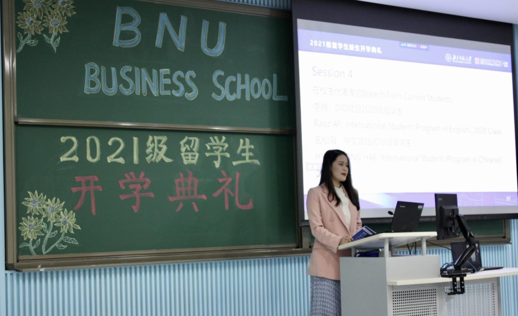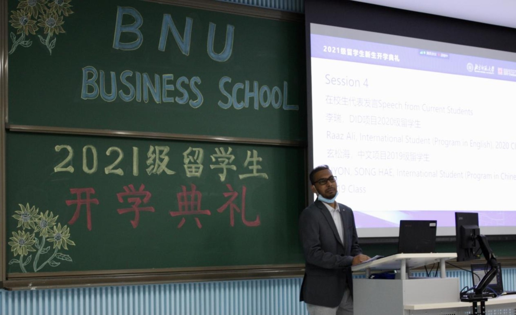 在在校生發(fā)言中,2020級英文項目博士生代表Raaz Ali(巴基斯坦籍)介紹了自己自碩士階段起在北師大的求學(xué)經(jīng)歷,鼓勵同學(xué)們在這個充滿學(xué)術(shù)氛圍和人文關(guān)懷的環(huán)境里充分挖掘自己的潛力,努力成為一名連結(jié)中國與自己母國的信使。2019級中文項目留學(xué)生玄松海(朝鮮籍)分享了自己在北師大學(xué)習(xí)與生活的經(jīng)驗,她希望新同學(xué)們在新環(huán)境中照顧好自己,學(xué)會理解與關(guān)愛,學(xué)會互補與交流。把握來之不易的學(xué)習(xí)機會,樹立遠(yuǎn)大理想,立足學(xué)科前沿知識,并積極探索。