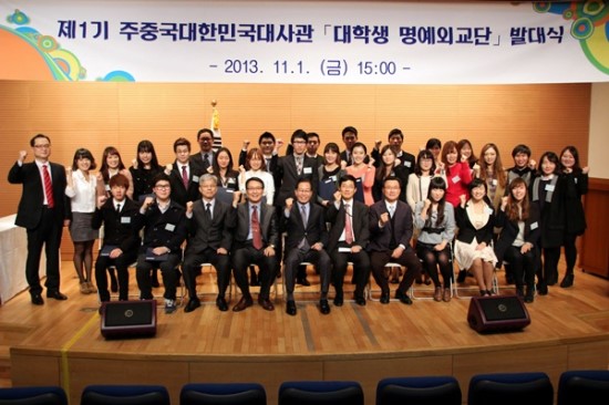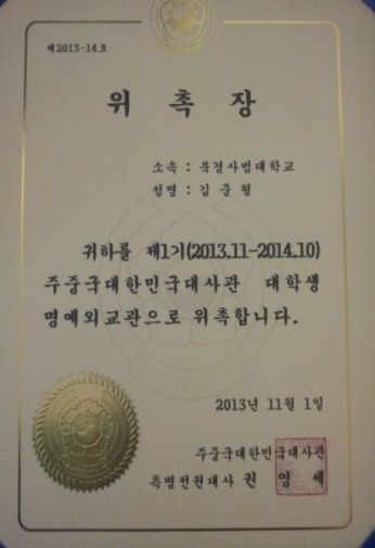 2013年11月, 留學(xué)生金俊炯被韓國使館任命第一屆“大學(xué)生名義外交官”; 在北京的各大學(xué)和多所中學(xué)開展多次文化交流活動。