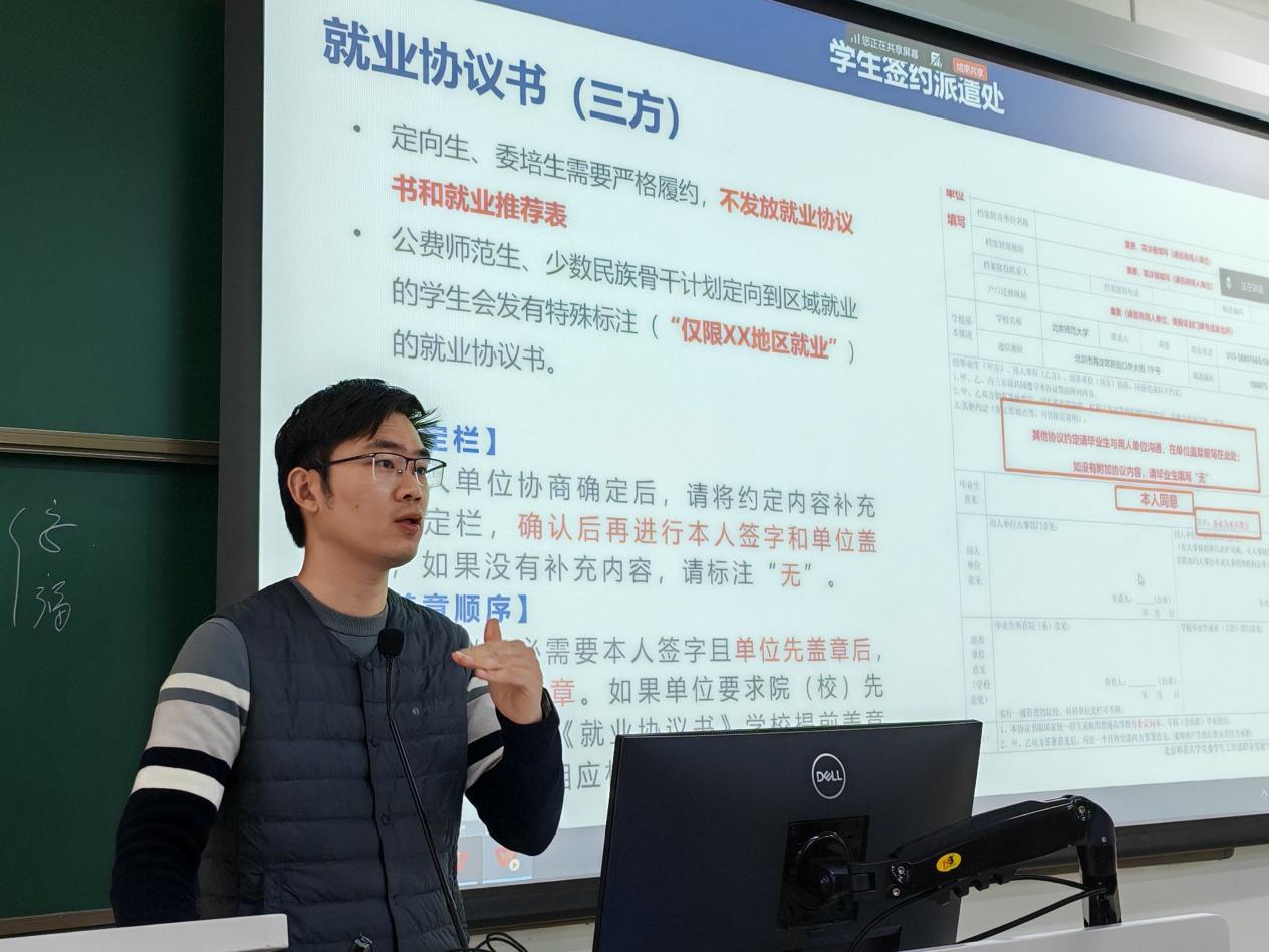 李論老師作就業(yè)政策解讀。他詳細(xì)地為同學(xué)們介紹了我國部分城市人才引進(jìn)政策以及主要的政策性項(xiàng)目,以及三支一扶、特崗教師、志愿服務(wù)西部計(jì)劃、大學(xué)生參軍入伍、國際組織實(shí)習(xí)項(xiàng)目、科研行政助理、保研等其他政策性項(xiàng)目。此外,他對就業(yè)推薦表、就業(yè)協(xié)議書、戶檔轉(zhuǎn)遷、改派手續(xù)等畢業(yè)生常見的就業(yè)問題進(jìn)行了詳細(xì)解答,并介紹了就業(yè)派遣系統(tǒng)填報(bào)的操作指南與注意事項(xiàng)。