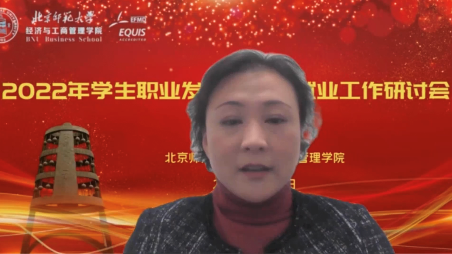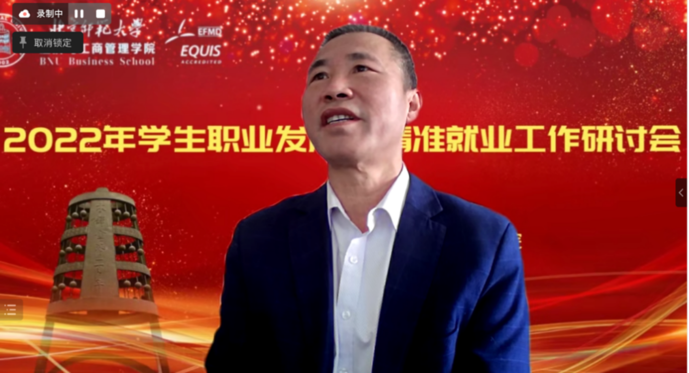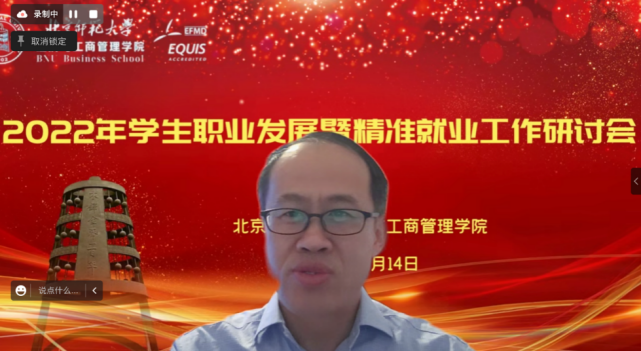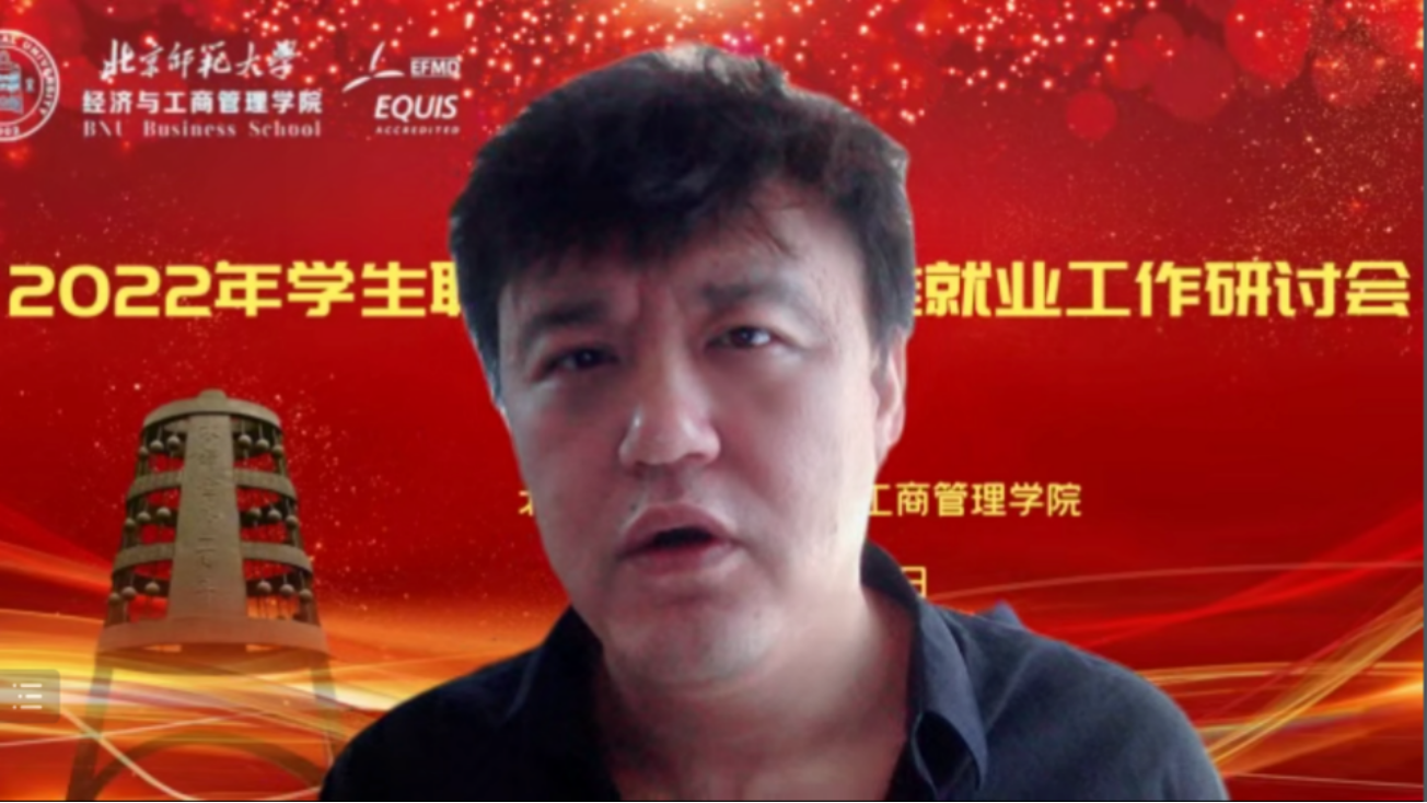12月14日,北京師范大學經(jīng)濟與工商管理學院在線上平臺舉辦了2022年學生職業(yè)發(fā)展暨精準就業(yè)工作研討會。教育部學生發(fā)展中心生涯發(fā)展教育處處長楊洪濤、北京師范大學黨委學生工作部部長隋璐璐、清華大學學生職業(yè)發(fā)展指導中心副主任金蕾蒞、浙江大學經(jīng)濟學院黨委副書記盧飛霞、新精英生涯高校事業(yè)部總監(jiān)李春雨、北京師范大學黨委學院工作部副部長呂曉慧、北京師范大學黨委學生工作部職業(yè)發(fā)展與就業(yè)指導中心主任郭智芳等校內(nèi)外嘉賓出席了會議。學院黨政班子成員、學工團隊教師和全體班主任參會。