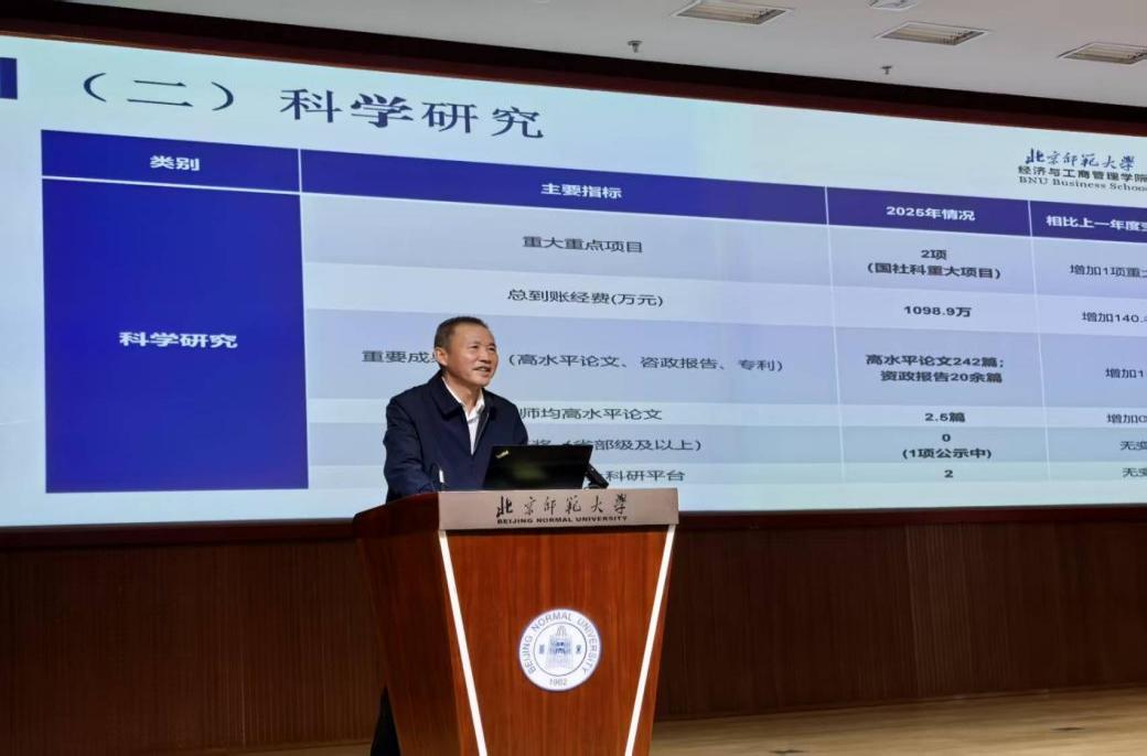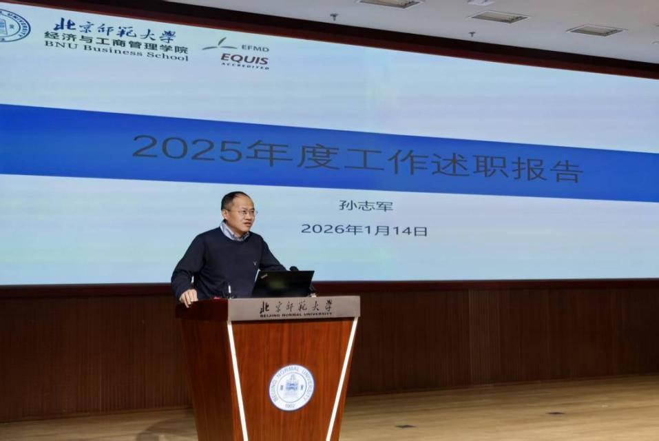 2026年1月14日,經(jīng)濟與工商管理學院2025年度總結(jié)暨班子述職大會在北京師范大學京師學堂京師廳舉行。學院黨政班子成員分別進行2025年度工作總結(jié)和述職述廉。會議由戚聿東院長主持。