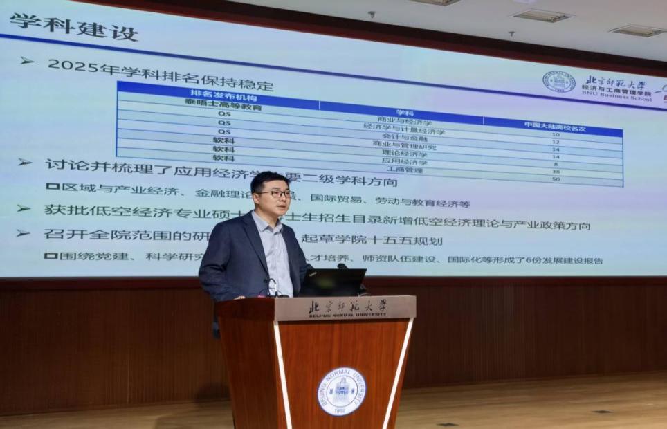 最后,院長戚聿東代表學院行政班子總結(jié)了2025年學院發(fā)展成效,就未來五年規(guī)劃主要目標和關(guān)鍵指標進行了說明。他表示,2025年學院在人才培養(yǎng)、學科建設、科研產(chǎn)出、國際化辦學等關(guān)鍵指標上均實現(xiàn)了穩(wěn)步提升,特別是在國際認證、國家高層次人才建設和國家重大科研項目等方面取得了顯著成績,圓滿完成學院“十四五”規(guī)劃各項目標和指標。展望“十五五”時期,學院將實施“學科躍升、人才強院、國際引領(lǐng)”三大工程,通過“戰(zhàn)略、學科、育人、開放”四個維度的深度融合,朝著具有人文底蘊和國際影響力的一流經(jīng)管學院愿景再上新臺階。