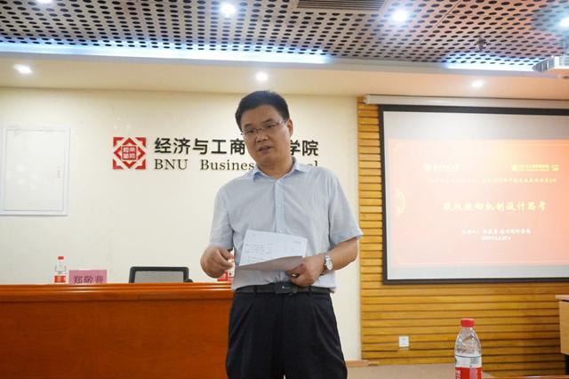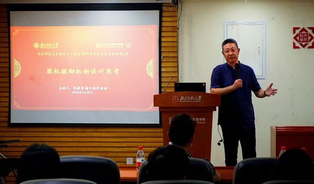 2019年6月20日,由經管學院校友會主辦的北京師范大學經濟與工商管理學院40周年院慶校友講壇第3講在京師大廈9406會議室成功舉辦。經管學院校友、MBA校外導師、海川視野咨詢、海川生態(tài)私董會創(chuàng)始人鄭敬普老師受邀蒞臨我院,以“股權激勵機制設計思考”為題開講,講座內容精彩紛呈,贏得陣陣掌聲。本次講座由經管學院分黨委副書記、校友會常務副會長葛玉良擔任主持人,經管學院院長戚聿東及數十名師生與校友參加了此次講座。