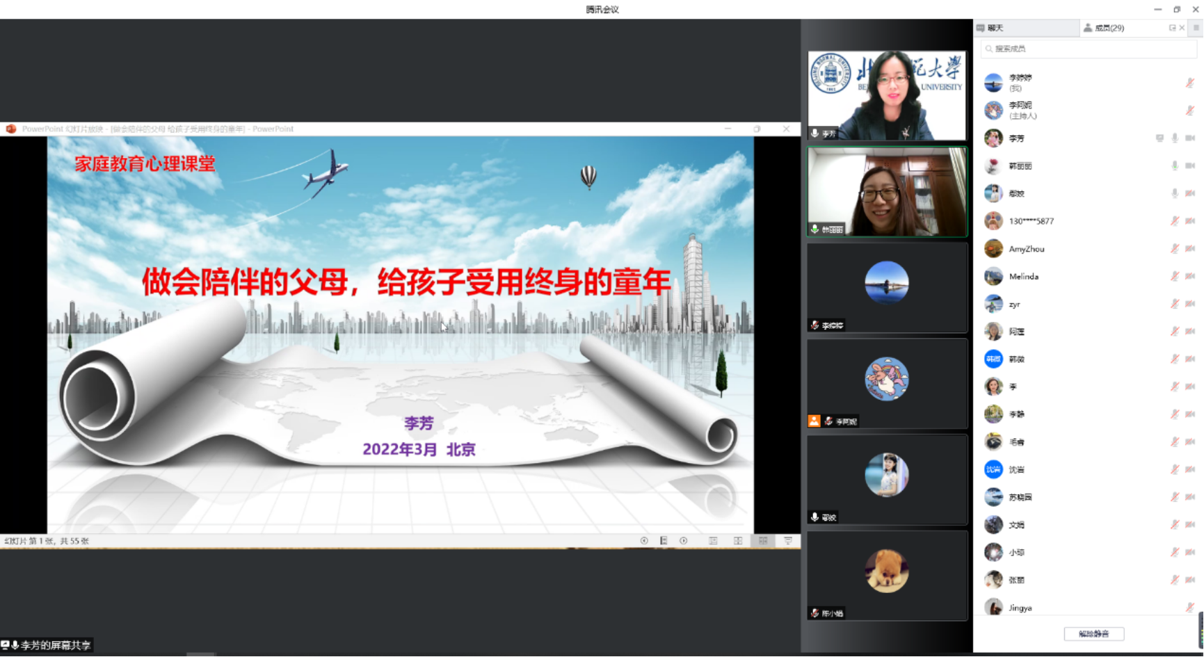 為迎接北京師范大學(xué)120周年校慶,傳播良好的家庭教育理念,2022年3月18日下午,北師大經(jīng)管學(xué)院校友會(huì)與學(xué)院工會(huì)聯(lián)合舉辦了主題為“做會(huì)陪伴的父母,給孩子受用終身的童年”的線上家庭教育心理課堂。本次活動(dòng)邀請(qǐng)到北師大經(jīng)管學(xué)院校友、教育經(jīng)濟(jì)學(xué)博士、對(duì)外經(jīng)濟(jì)貿(mào)易大學(xué)副研究員李芳老師主講,60余位教師與校友參加。