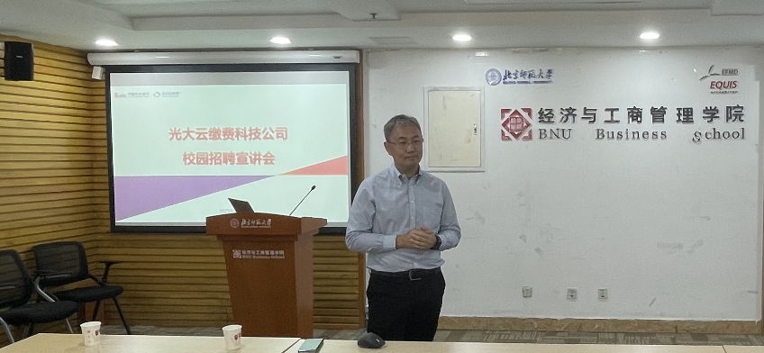 2023年9月13日,北師大經(jīng)管學(xué)院與光大云繳費科技有限公司聯(lián)合開展“云聚夢想,青春費騰”主題講座,面向我院全體師生宣講2023年實習(xí)生聯(lián)合培養(yǎng)項目。此次宣講會邀請光大云繳費科技有限公司人力資源部經(jīng)理李根、李思默為主講嘉賓,面向各年級學(xué)生,對公司概況與實習(xí)項目進行介紹,充分調(diào)動了同學(xué)們參與實習(xí)項目的積極性。參與此次會議的有學(xué)院黨委副書記江婕,雙肩挑輔導(dǎo)員李論,以及我院各年級學(xué)生。
