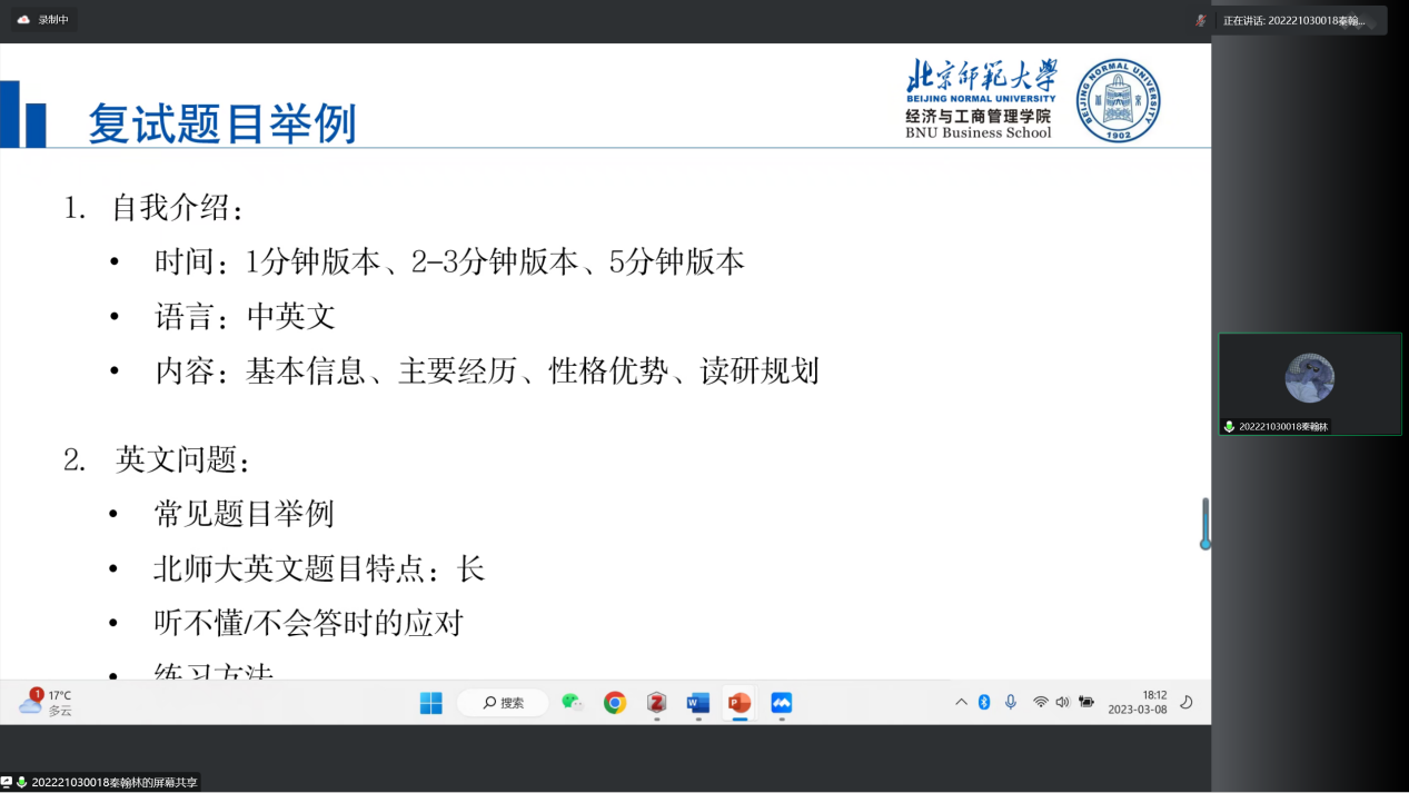 首先進行分享的是上岸北京師范大學應用經濟學金融學學術碩士的秦瀚林。秦瀚林結合自己的經歷,總結了復試時回答問題的邏輯、聲音及時長等若干技巧。此外,針對北京師范大學經濟學考研復試,秦瀚林從自我介紹、英文問題、專業(yè)課題目、經歷、社會熱點問題等方面對復試常見題目進行舉例分析,提出相關的練習方法和復習重點。