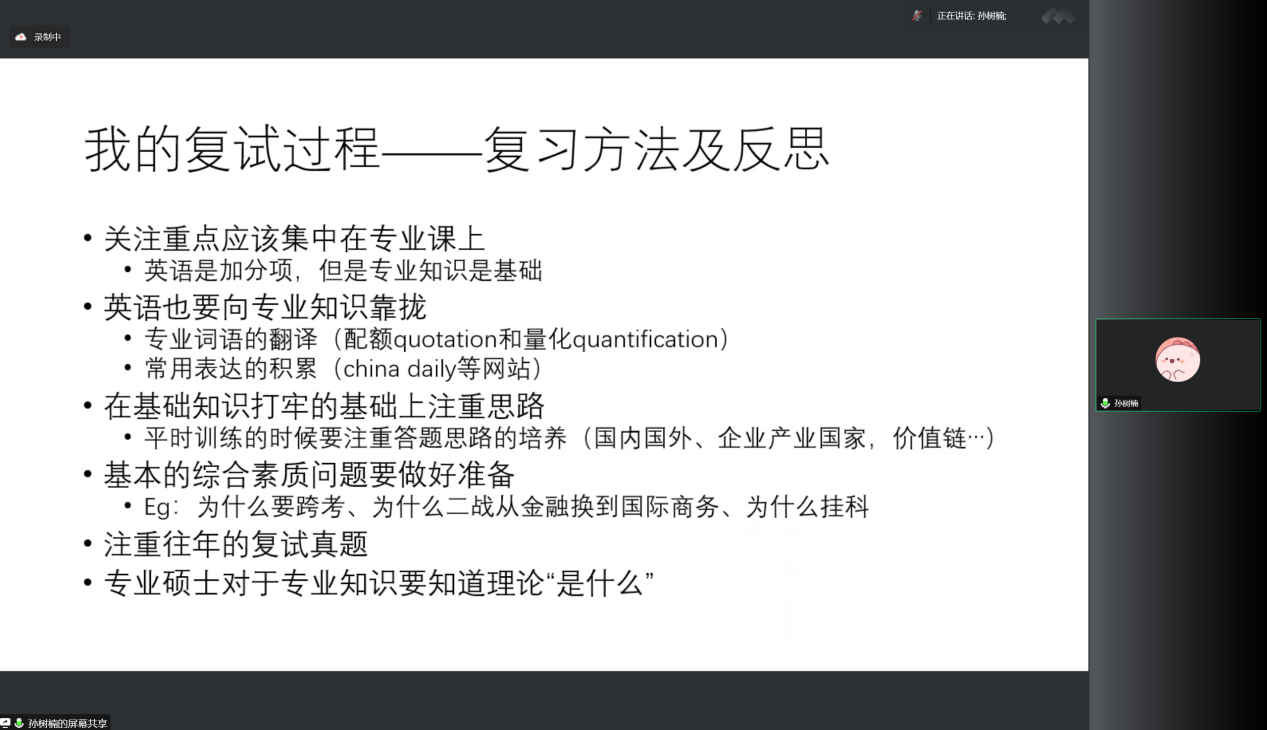 隨后由上岸中國人民大學國際商務專業(yè)碩士的孫樹楠進行分享。。孫樹楠介紹了國際商務專碩的考試內容,并結合自己的復試過程對復習方法進行了反思,給出每個科目相應的備考建議,著重強調往年復試真題、復試考場規(guī)則及信息搜集的重要性。最后,孫樹楠就復試中個人簡歷、著裝、線下面試等問題與大家展開交流。