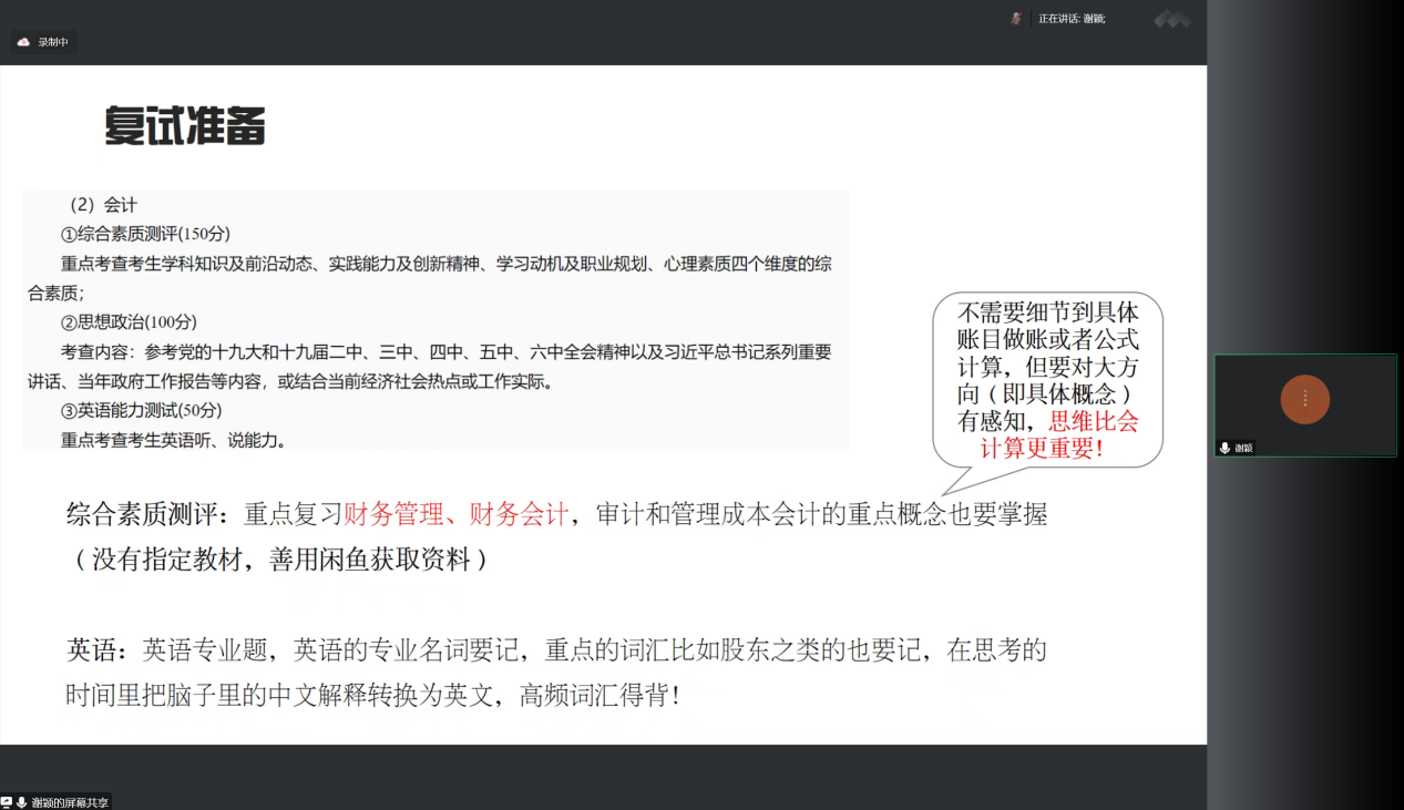接著向大家分享的是上岸北京師范大學會計學專業(yè)碩士的謝穎。首先,謝穎詳細梳理了會計學專碩的復試流程,并從政治、英語和中文專業(yè)題三個方面著重介紹專業(yè)問答這一環(huán)節(jié)。其次,謝穎對前兩年的復試真題進行了分析、解讀和總結,提醒同學們在復試準備時應該重點復習財務管理、財務會計兩門專業(yè)課程,熟記英語專業(yè)詞匯,緊密聯(lián)系時事熱點。