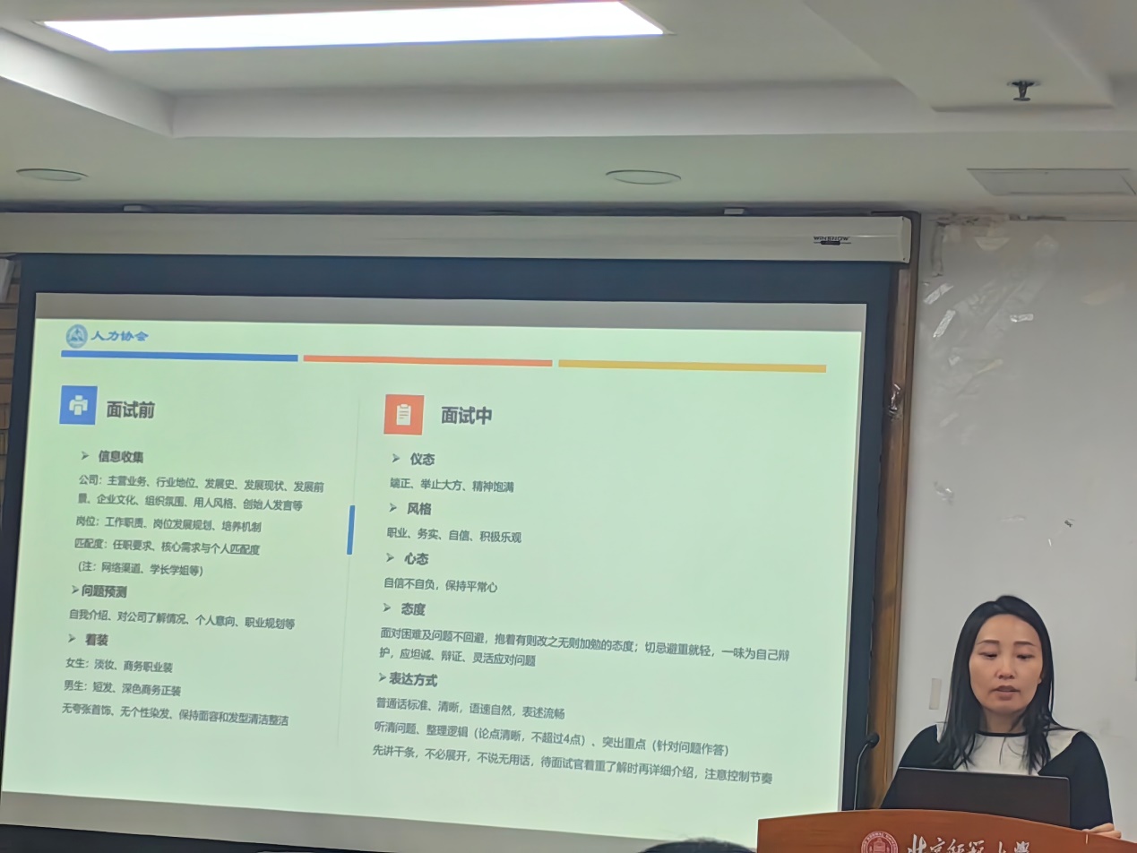 王曉輝還就面試準(zhǔn)備和過程中的注意事項(xiàng)提供了實(shí)用建議。她建議求職者在準(zhǔn)備時要全面了解企業(yè)信息和應(yīng)聘崗位,以及個人與崗位的匹配度。在面試過程中這一環(huán)節(jié),她強(qiáng)調(diào)了自我介紹的重要性、適當(dāng)?shù)闹b、保持良好的儀態(tài)與心態(tài),以及如何應(yīng)對壓力面試和陷阱問題。此外,她還強(qiáng)調(diào)了面試準(zhǔn)備的重要性,表明這是對機(jī)遇和企業(yè)的尊重。