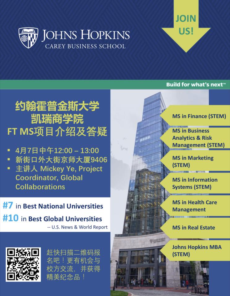 約翰霍普金斯大學(xué)凱瑞商學(xué)院(Johns Hopkins University, Carey Business School)將于2023年4月7日舉行宣講會(huì),歡迎感興趣的同學(xué)報(bào)名參加。